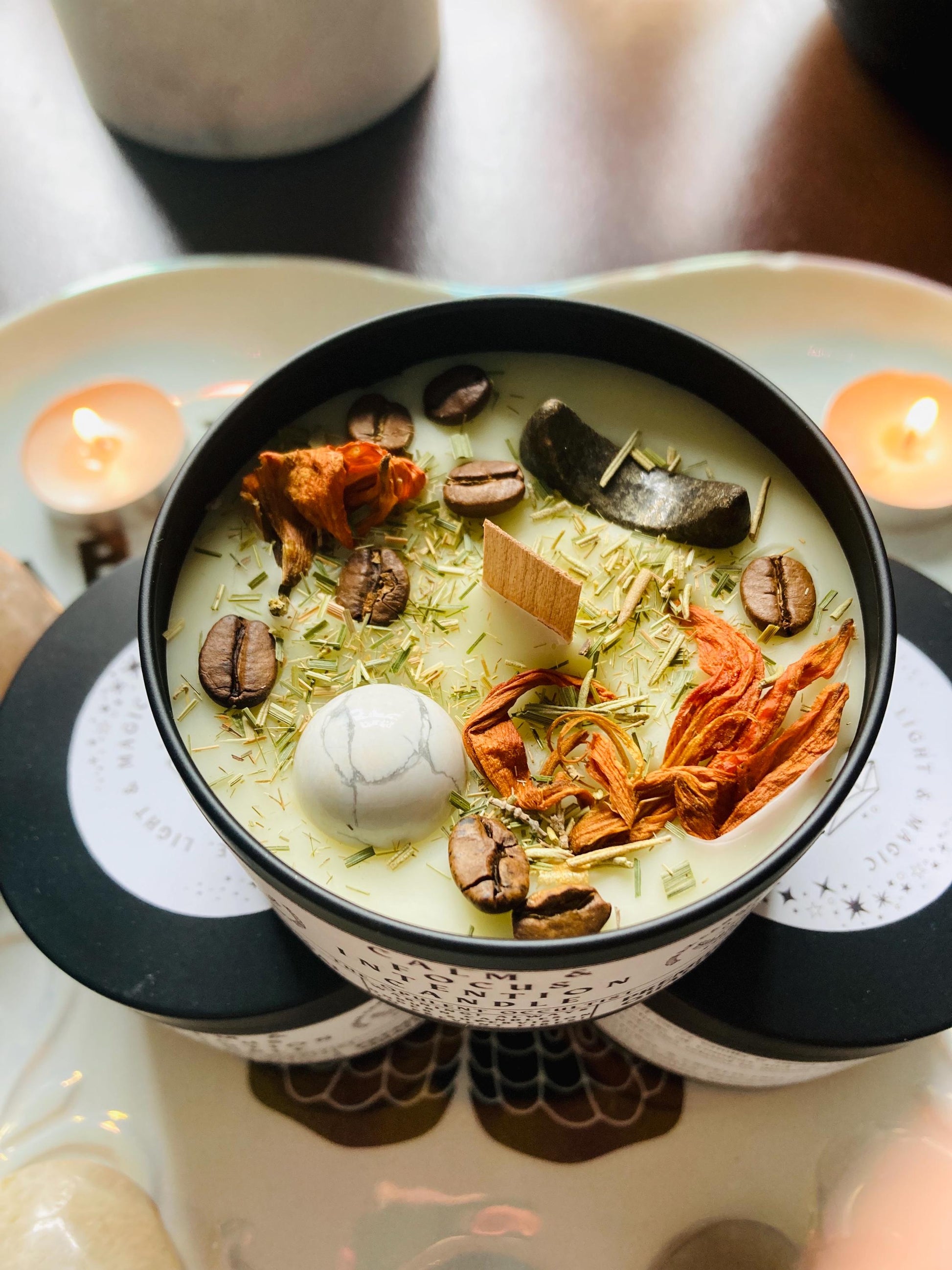 Current Ingredients: Sweet Vanilla Scent, Howlite Mini Sphere, Pyrite Moon, Lily Petals, Coffee Beans, Rosemary & Lemongrass.