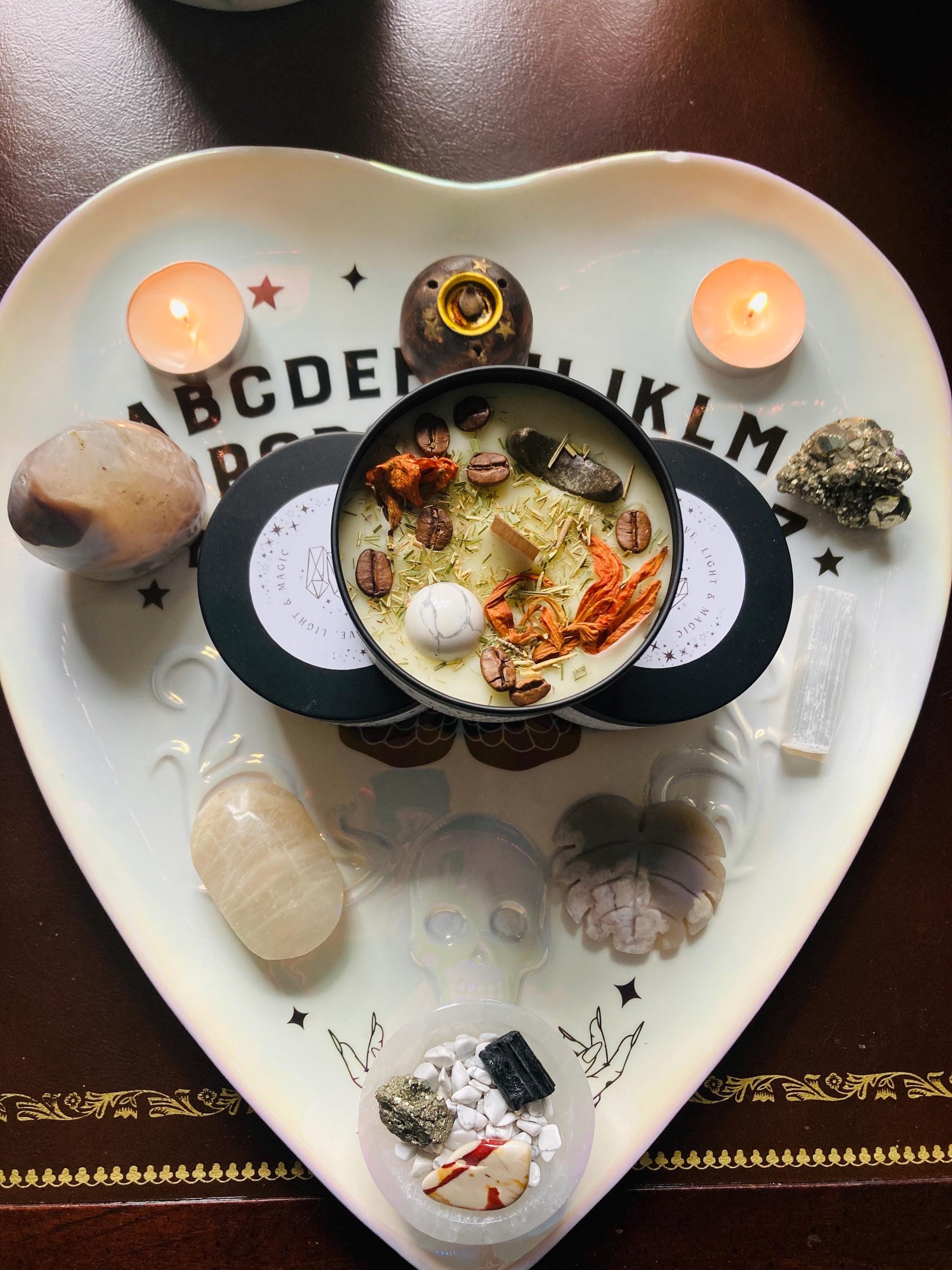 ⚠️ Candle Safety: Always burn within sight and under supervision. Keep away from flammable objects, children, and pets. Herb/Flower elements of candle can catch flame at times.